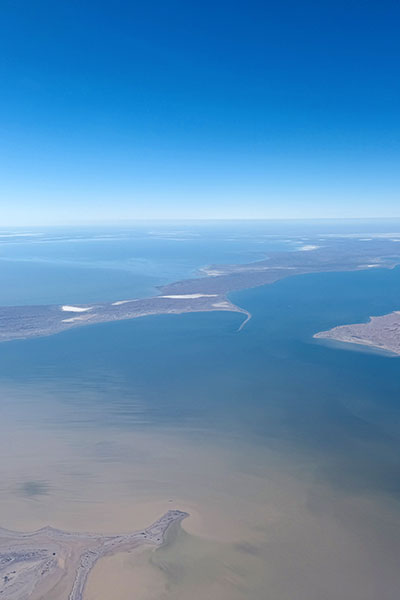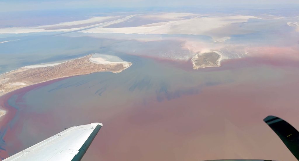 From the air, it is extraordinary. Endless desert suddenly broken by shimmering water, winding channels, and evolving patterns that change week by week.